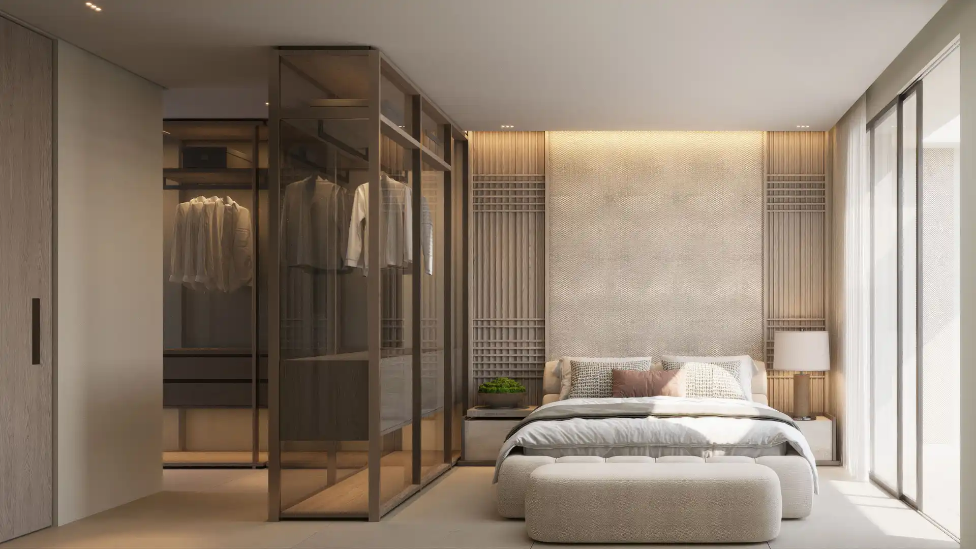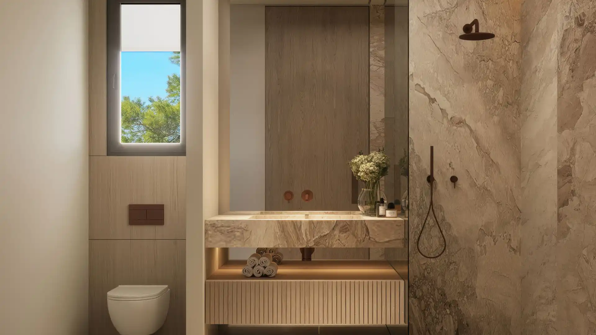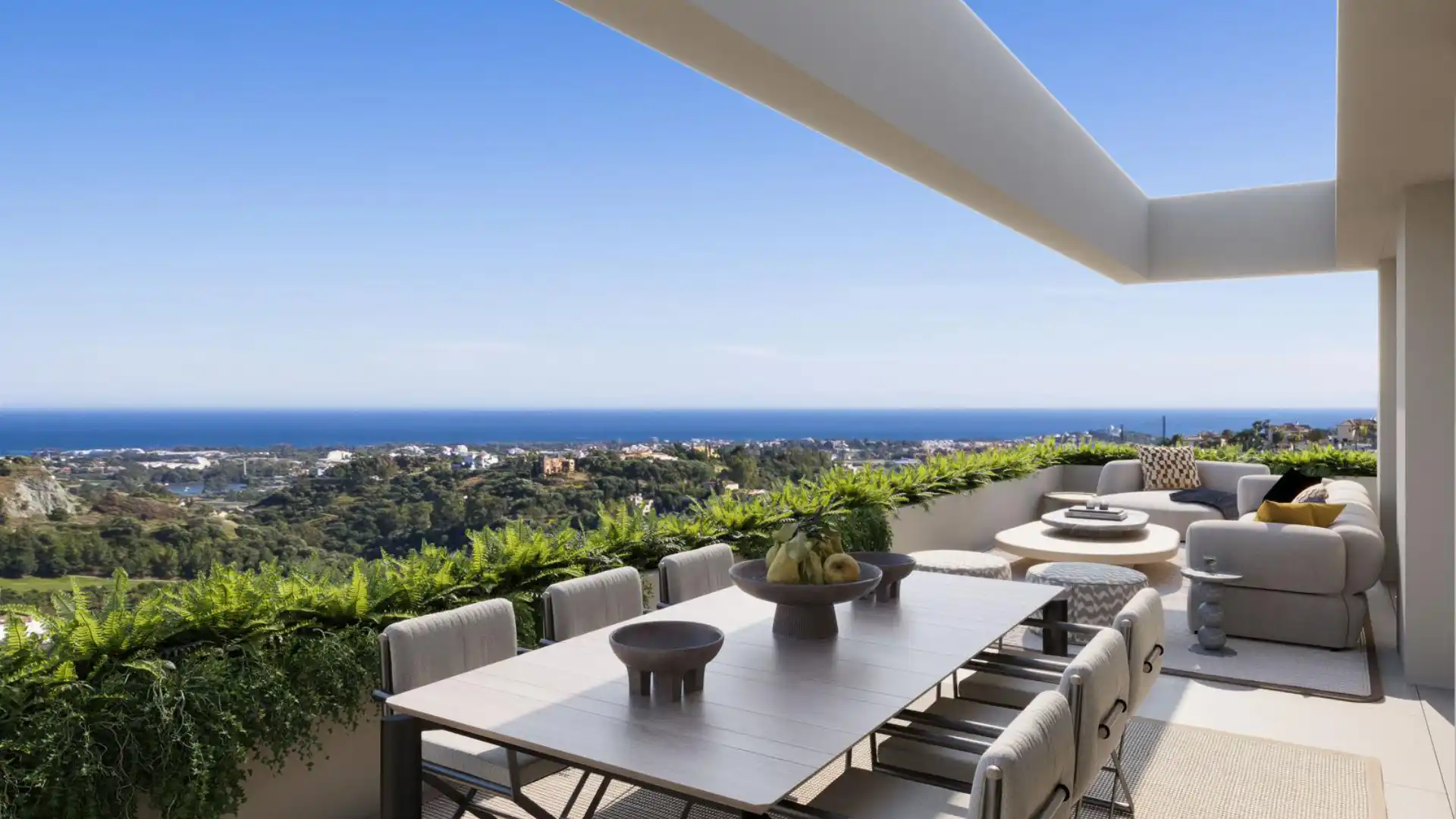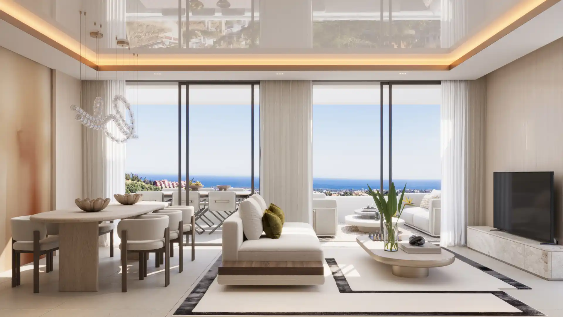 Każdy apartament posiada dwie sypialnie i dwie łazienki, zaprojektowane z myślą o równowadze, komforcie i funkcjonalności. Główna część dzienna otwiera się bezpośrednio na taras przez szerokie, przeszklone drzwi, które wpuszczają naturalne światło do wnętrza, jednocześnie zapewniając otwarte widoki na morze. Wykończenie wnętrz utrzymane jest w wyrafinowanej palecie neutralnych barw i wysokiej jakości materiałów, tworząc nowoczesną atmosferę, która jest jednocześnie ciepła i stonowana. Układ został starannie zaplanowany, aby zapewnić płynne przemieszczanie się między salonem, jadalnią i przestrzenią zewnętrzną.