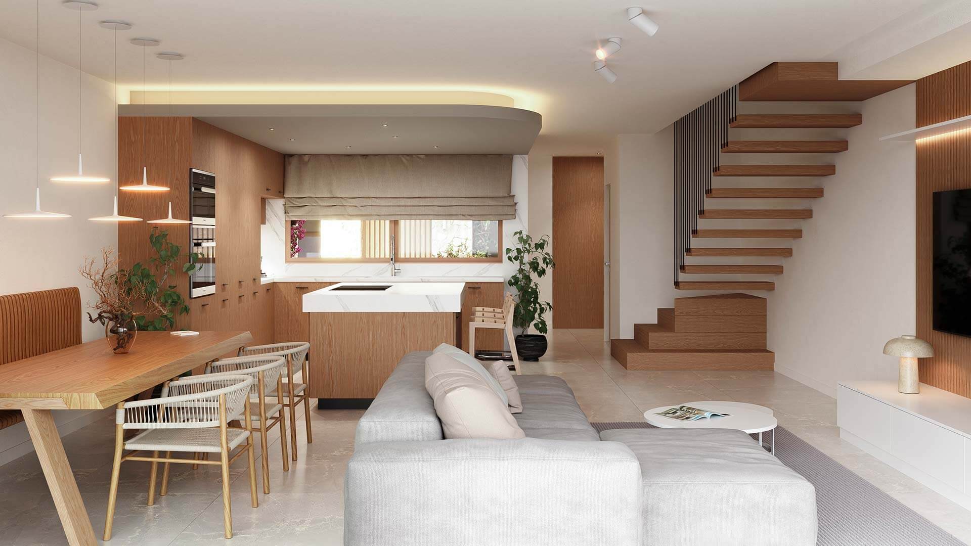Każdy dom szeregowy oferuje co najmniej 120 m² komfortowej przestrzeni mieszkalnej, z jasną i przestronną, otwartą strefą dzienną, podkreśloną dużymi oknami, które wypełniają wnętrze naturalnym światłem. Nowoczesna kuchnia z centralnie umieszczoną wyspą i wysokiej jakości wykończeniem sprawia, że jest to idealne miejsce zarówno do gotowania, jak i spotkań towarzyskich. Na piętrze mieszkańcy znajdą trzy przestronne sypialnie i dwie eleganckie łazienki, zaprojektowane z wykorzystaniem nowoczesnych elementów wyposażenia i wysokiej jakości materiałów. Dla tych, którzy szukają odrobiny luksusu, narożne apartamenty oferują czwartą sypialnię i dodatkową łazienkę na parterze, a także prywatny taras na dachu, z którego roztacza się panoramiczny widok na okolicę. Wybrane domy posiadają również prywatne ogrody z możliwością dodania basenu, a inne oferują rozległe tarasy idealne do relaksu lub posiłków na świeżym powietrzu z rodziną i przyjaciółmi.