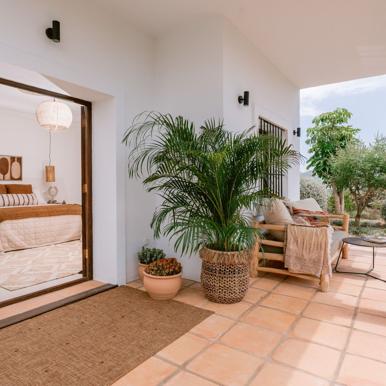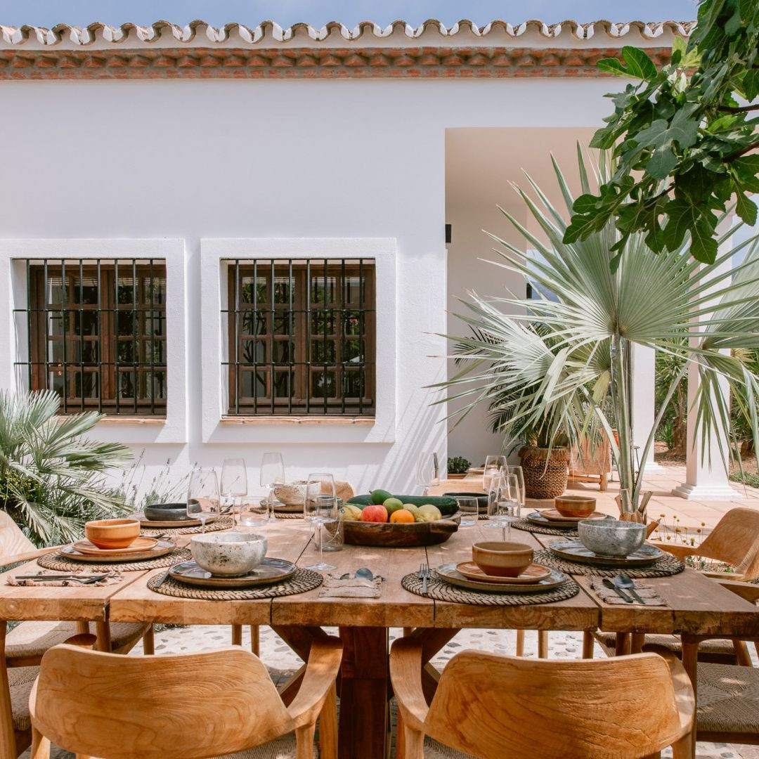 Z salonu jest bezpoÅ›redni dostÄ™p do zadaszonych tarasów, centralnego, żwirowego dziedziÅ„ca i ogrodów. ZostaÅ‚y one starannie zaprojektowane, aby ożywić Å›ródziemnomorskÄ… istotÄ™. Jest wiele miejsc do jedzenia i picia wina na zewnÄ…trz, lub po prostu do czytania książki, lub podziwiania niesamowicie dobrze zagospodarowanych ogrodów. PÅ‚ynne połączenie wnÄ™trza i zewnÄ™trza tworzy rajskie, wakacyjne uczucie. Z dziedziÅ„ca jest niezależne wejÅ›cie do trzeciego apartamentu w lewym skrzydle Cortijo.