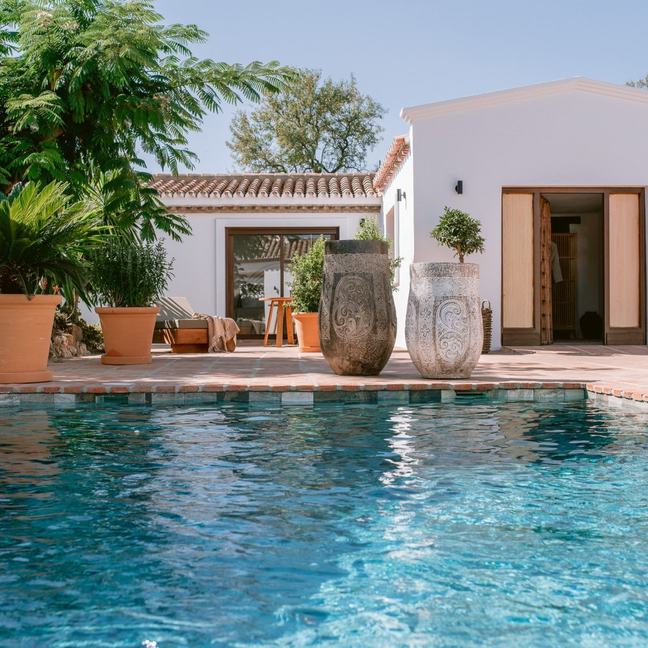 Przy basenie znajdziesz również zadaszony salon z sofami i kominkiem, który może być idealnym miejscem na grilla. To kolejna malownicza i stylowa przestrzeÅ„ do relaksu i delektowania siÄ™ andaluzyjskim snem. Dalej przy basenie znajduje siÄ™ kolejny zadaszony taras, idealny na porannÄ… sesjÄ™ jogi. StÄ…d również roztaczajÄ… siÄ™ zapierajÄ…ce dech w piersiach widoki na okolicÄ™.