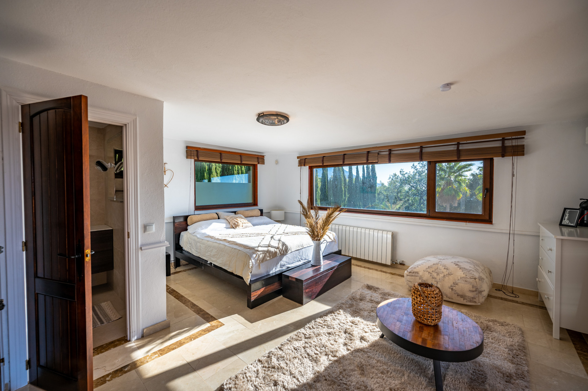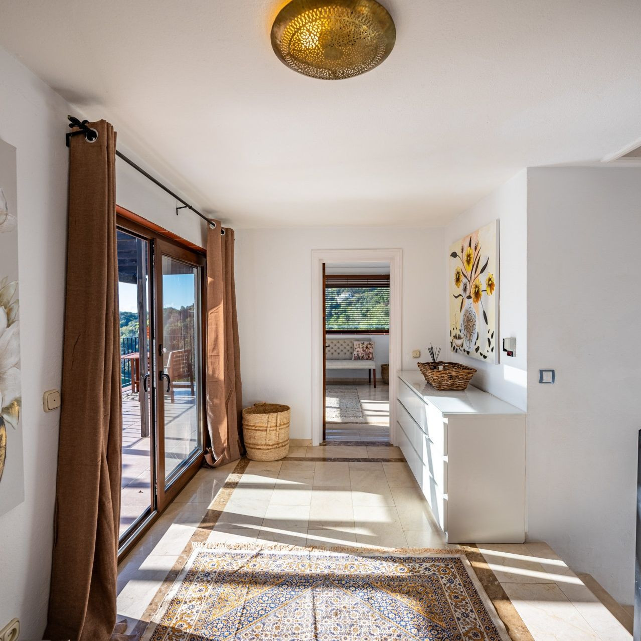W pełni wyposażona, niedawno odnowiona kuchnia znajduje się na parterze po lewej stronie wejścia. Wyposażona w wyspę i stołki do pogawędek podczas gotowania. Wszystkie urządzenia są nowe, z wyjątkiem kuchenki. Zainstalowano mały bojler na gorącą wodę do natychmiastowego podgrzewania wody. Na pierwszym piętrze znajdują się 3 sypialnie z łazienkami. Przestronny apartament główny z prysznicem i przesuwanymi drzwiami na taras. Apartament gościnny również otwiera się na taras. Trzecia sypialnia ma widok na ogród z tyłu. Wszystkie łazienki zostały niedawno odnowione. Wszystkie pokoje są wyposażone w klimatyzację (ciepło i zimno) obok centralnego ogrzewania. Cudowny i przestronny taras na tym pierwszym piętrze ma ponownie oszałamiające widoki na morze.