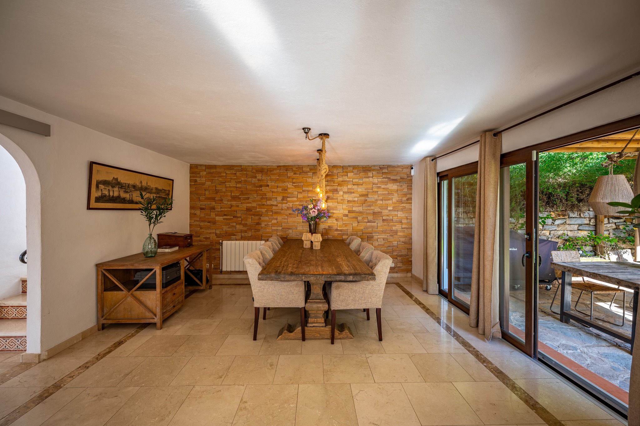 Przesuwne drzwi otwierają się na hol wejściowy z toaletą dla gości. Po prawej stronie znajduje się piękny otwarty salon/jadalnia. Ta piękna okolica jest połączona z przestronnym zadaszonym tarasem jadalnym z grillem i stawem rybnym. W salonie znajduje się dobrze działający piec na drewno. Z każdego okna roztacza się zapierający dech w piersiach widok. Z jednej strony palmy i morze, z drugiej pasmo górskie.